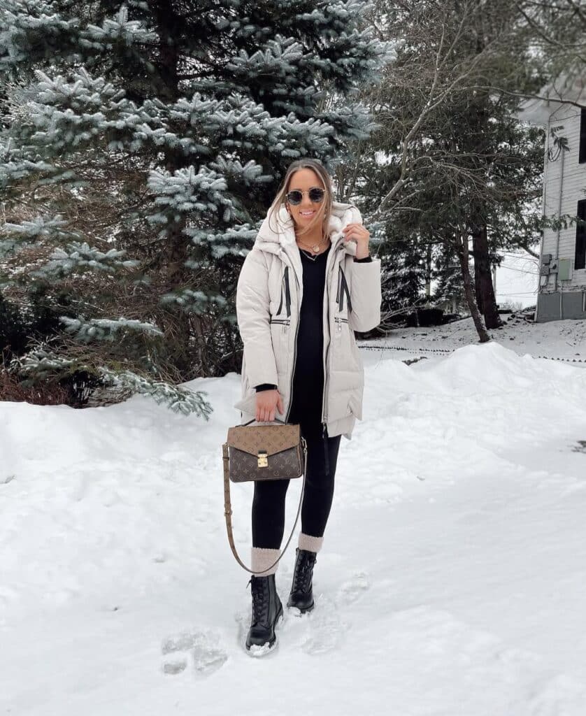 Glamorous, stylish and comfy. This is one of the easiest looks to throw on and you’ve instantly nailed a stylish maternity winter wear outfit. There are so many roll neck jumper knit dresses on the market, pair with knee high boots – flat or heeled. Add a cross body bag and oversized coat if you need the extra warmth.