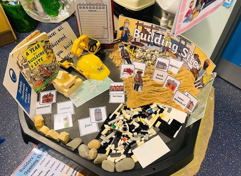 Get them setup with some initial building blocks and diggers, and have a bunch of building blocks in a basket next to the tuff tray so they can filter through and find the correct pieces they need to complete what they are building.