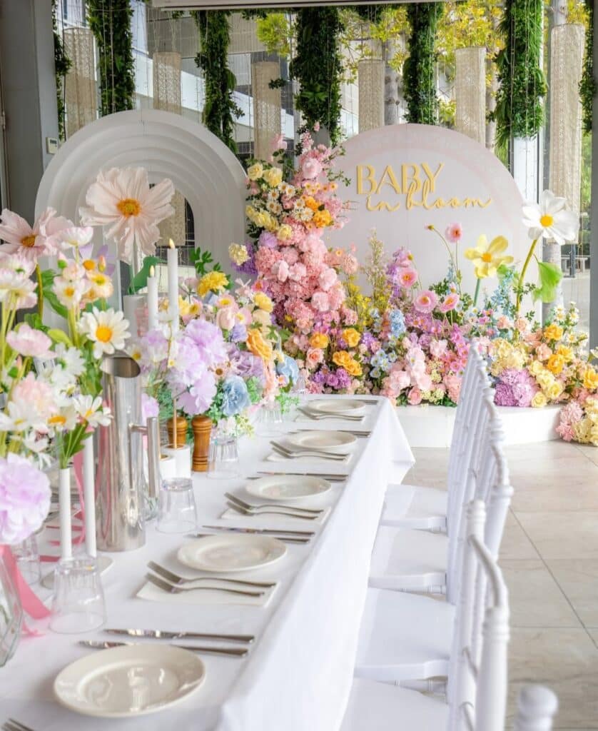 Check out this blooming mama to be! We love the ‘baby in bloom’ sentiment, it’s perfect for any season and looks amazing. Lots of bunches or floral arrangements are a must for this scheme. The perfect swap for balloons.