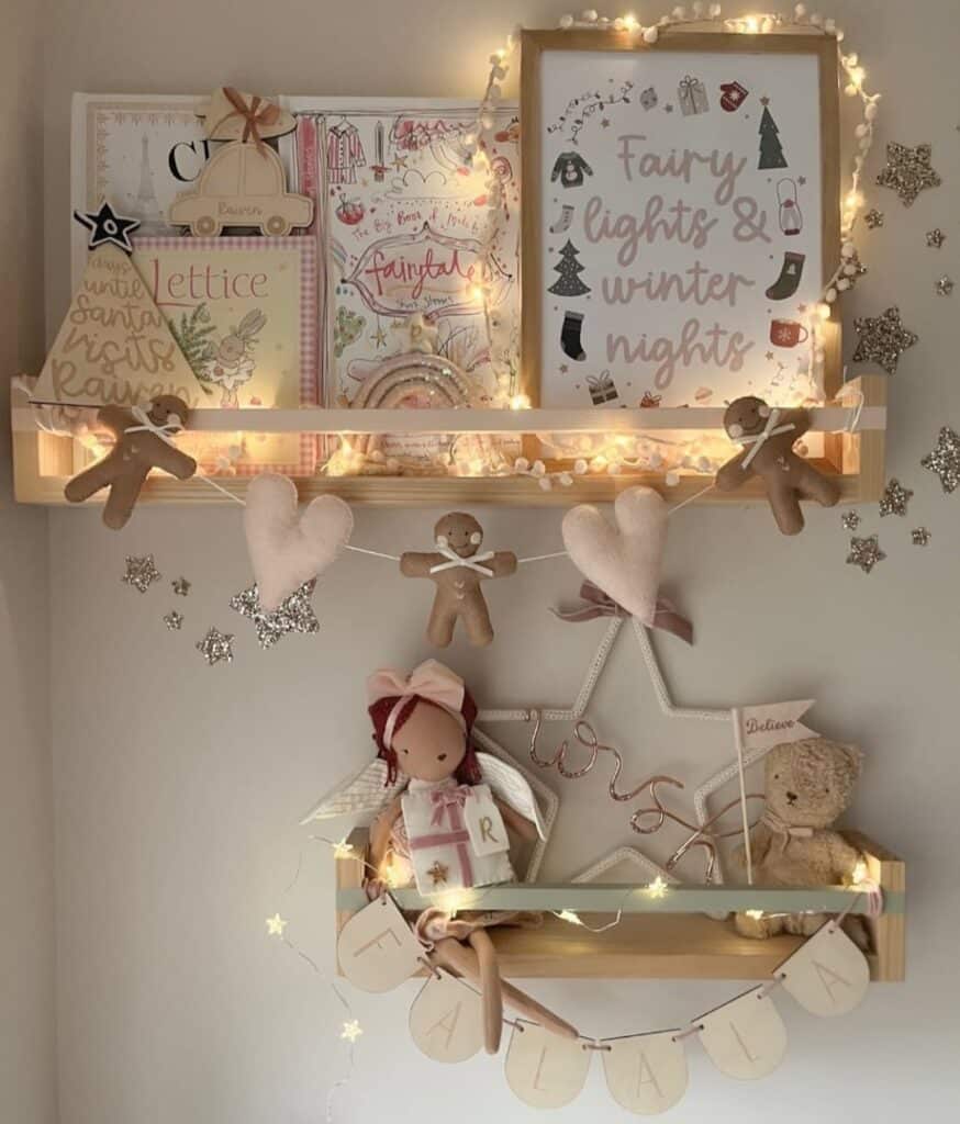 I couldn’t love this little setup anymore! If you have a little bookshelf in your little ones nursery, swap the books out for festive stories, lacing fairy lights among them and hanging garlands from the shelves for the sweetest festive update you can make.