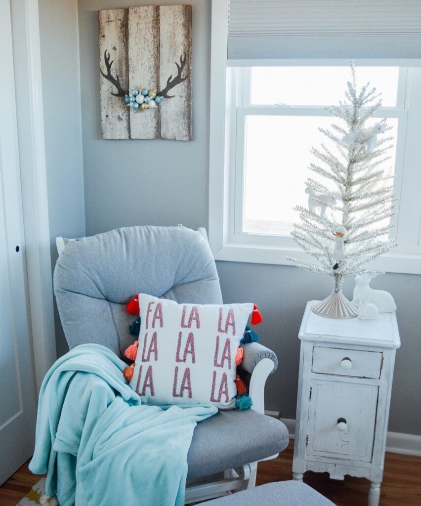 Note the subtle ‘Joyeux Noel’ wooden sign with pink font? It’s so simple and seamlessly works with the decor scheme in this nursery.