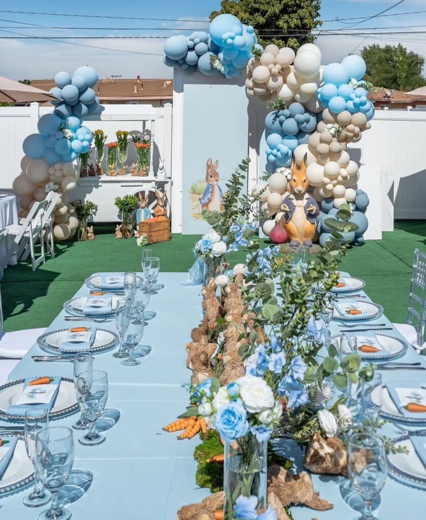 Add a gender reveal element to your baby shower with this ‘bunny bows or ribbon’ sentiment. From the backdrop to the table, if you’re serving guests food, bring a continuation with bunny shaped cookies and treats.