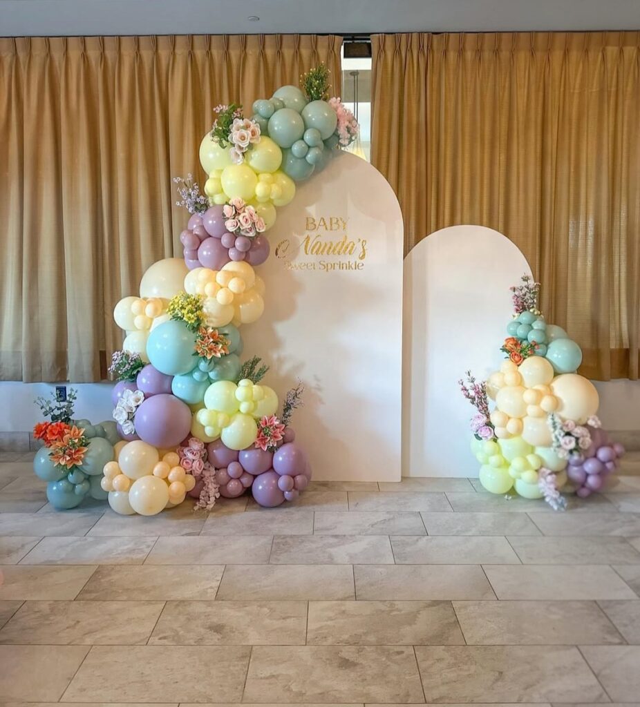 Take inspiration from the below image and add a candy colored balloon arch, with arch way backdrops which serve as a beautiful backdrop for photos. You could even add a dress list and get your guests to arrive in pastel colored clothing to extend the theme.