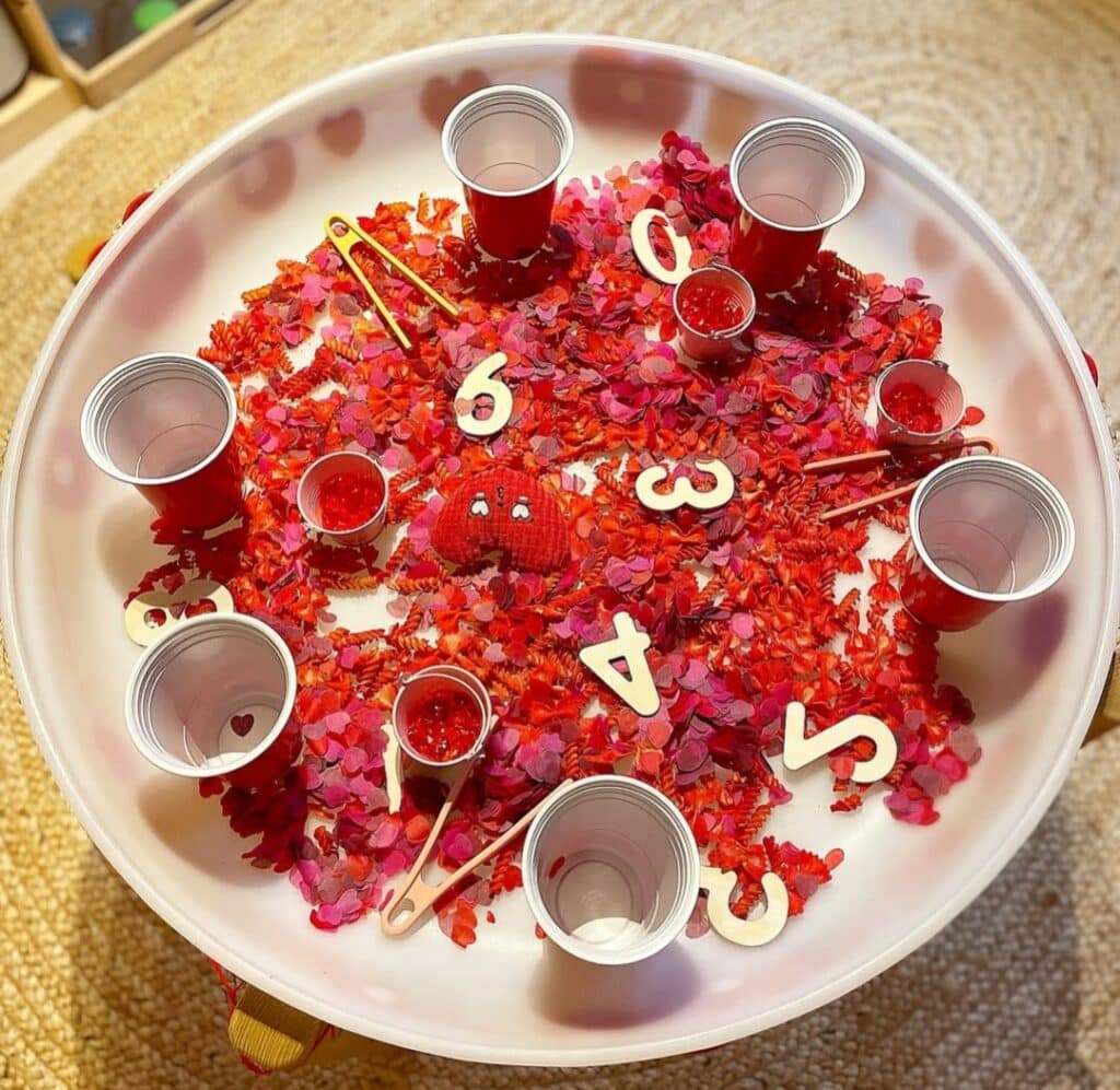 These collecting tuff tray setups are ideal for promoting hand eye co-ordination and counting skills. Fill your tuff tray with red and themed items and an array of tiny items such as pasta, confetti and numbers.