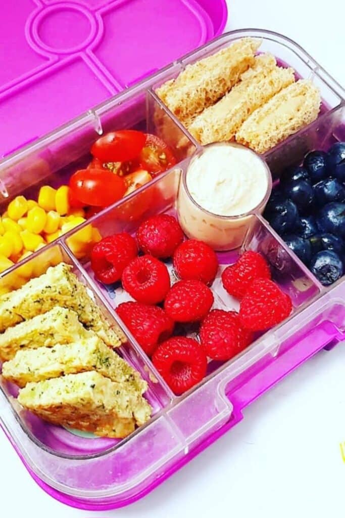 Featuring sweetcorn, tomatoes, peanut butter sandwiches, vegan cheesy broccoli fritters, raspberries, hummus and blueberries. A little bit of everything for your toddler to enjoy.