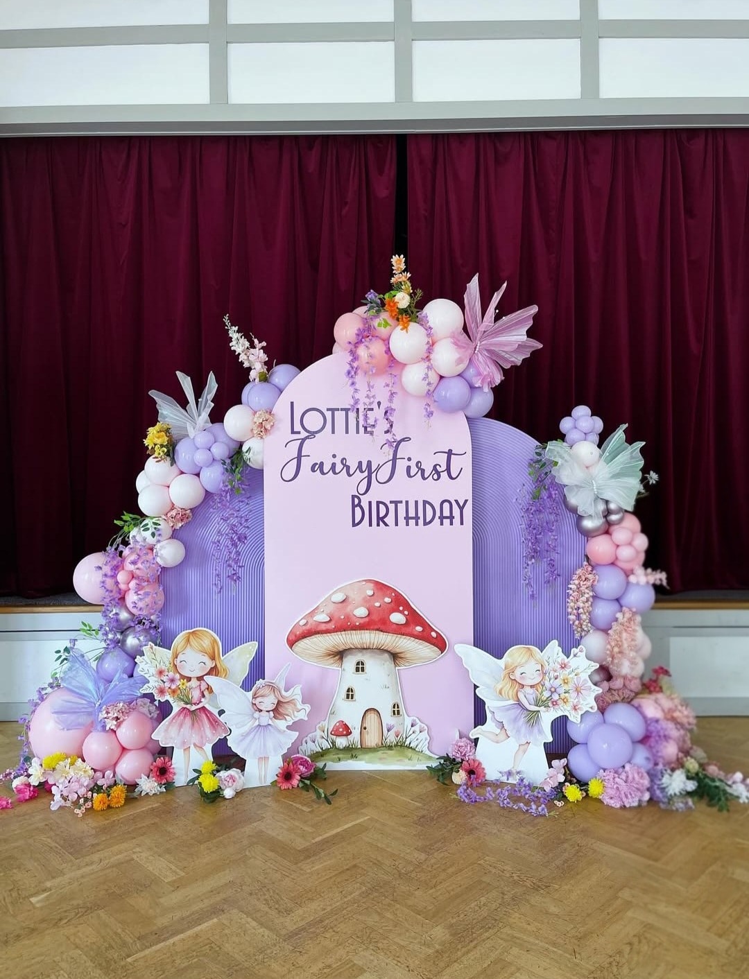 A pink, purple and white color scheme keeps things feeling magical. Include fairy and toadstool props or decorative items.