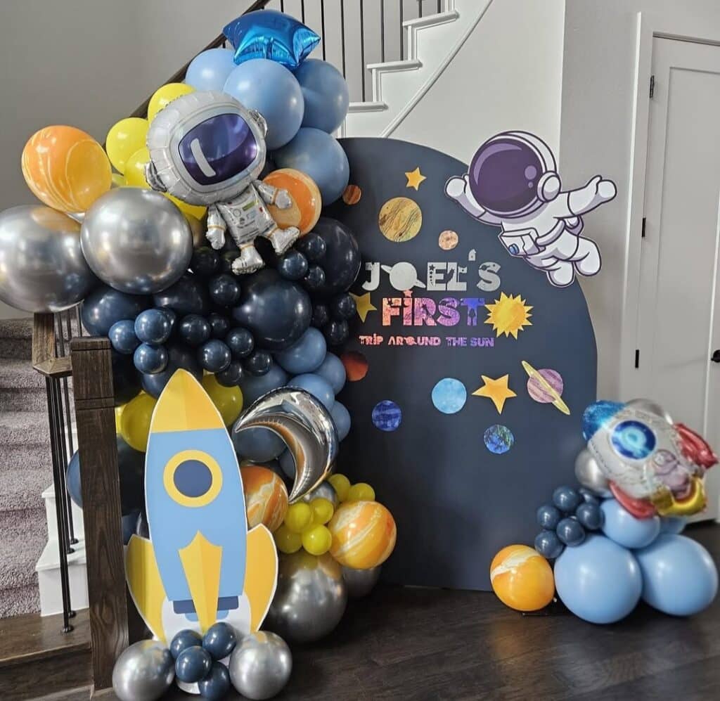 Theme it around space with an intergalactic backdrop, space balloons and metallic colored balloons.