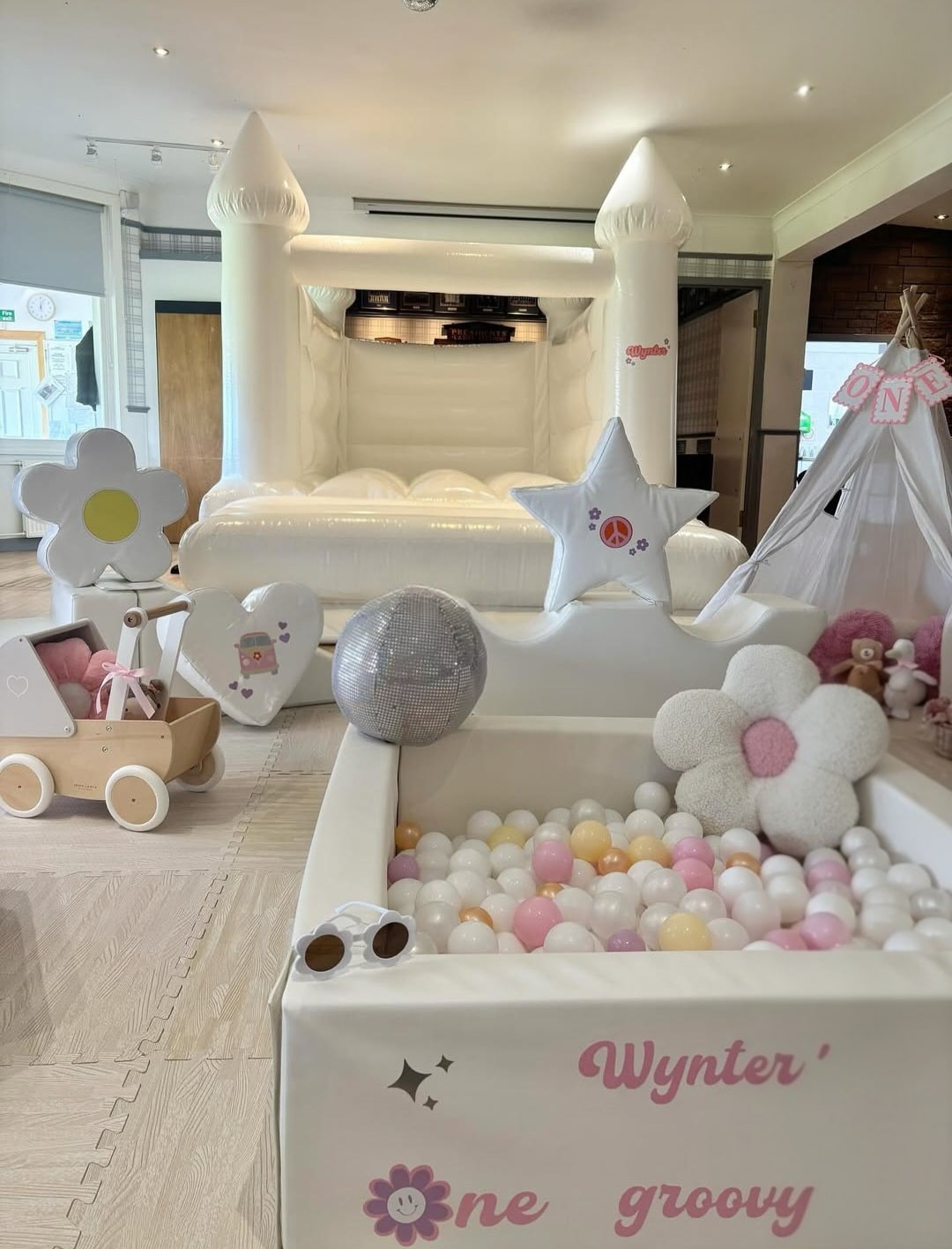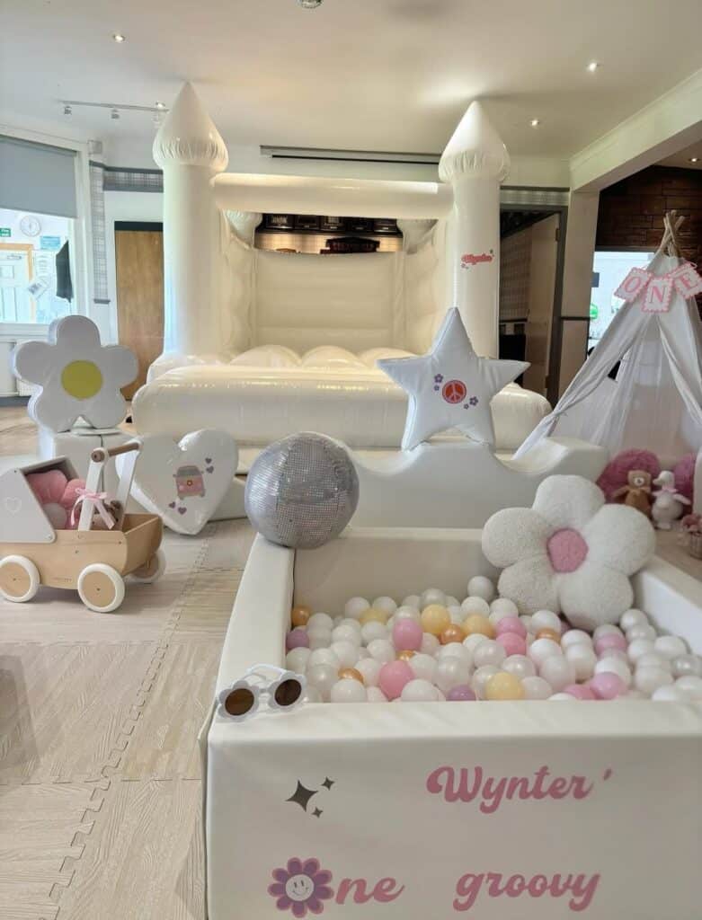 Celebrate your ‘one groovy chick’ with this retro setup! A bouncy castle and ball pit might be among their favorite things when they’re one, and it’s a perfect idea if you’re inviting along other babies their age too.