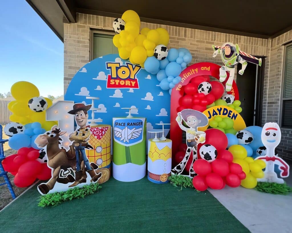 An epic backdrop with all of the iconic Toy Story colors, characters and placeholders for adding cakes and taking plenty of photos.