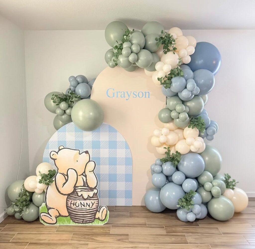 I adore the use of the soft muted green, cream and blue balloons in this setup for the sweetest backdrop. Add A Winnie the Pooh prop like the below, or add a few teddies!