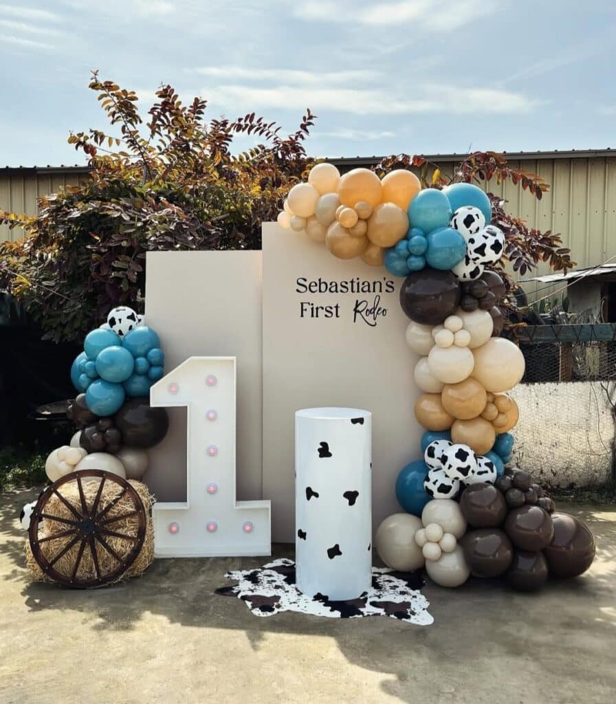 Use bold colors and intersperse with cow print balloons for that nod to the rodeo. Get guests to dress up as cowboys and cowgirls and add a hay bale or two to complete the most perfect backdrop for photos with your family and friends.