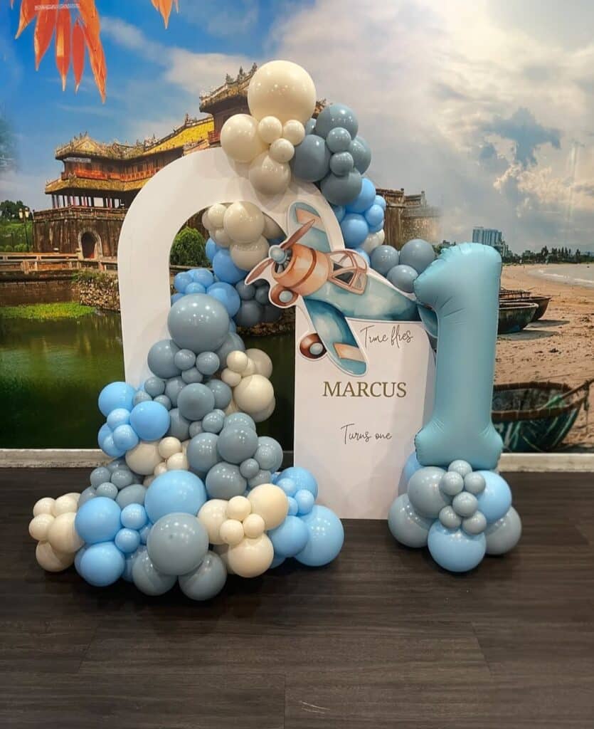 Theme it around aeroplanes and adopt a soft color palette and include plenty of balloons to create a similar look to the one below.