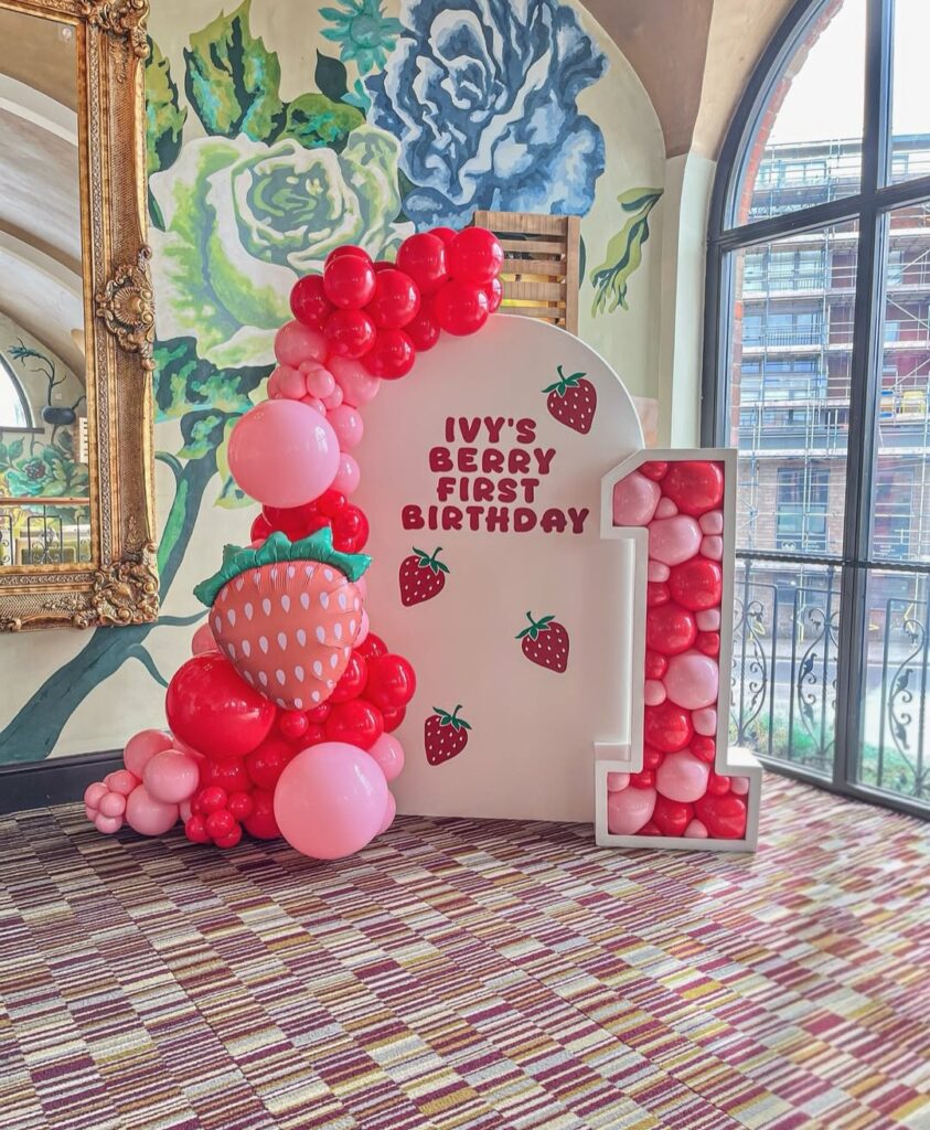 The below photo backdrop is the cutest with strawberries and a red and pink balloon arch, theme the party food to include strawberries, and plenty of pink and red food to eat.