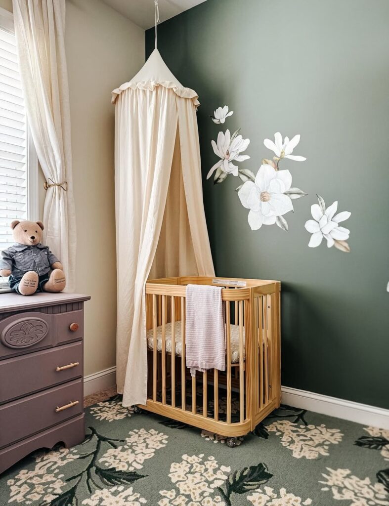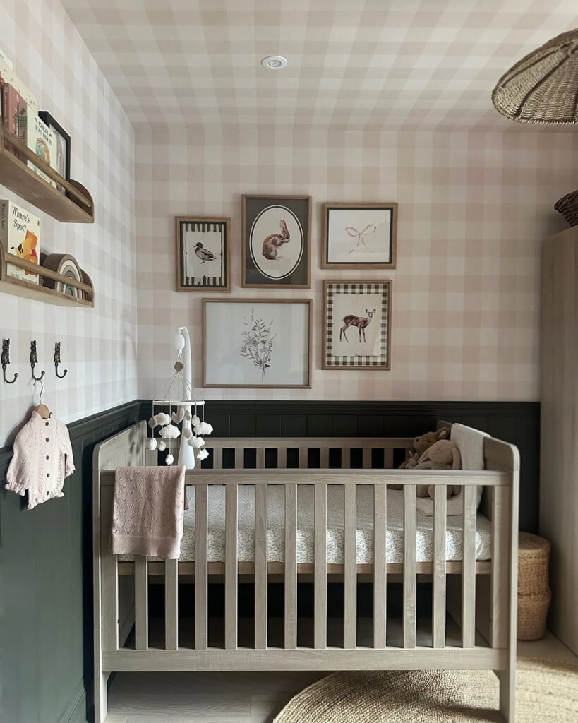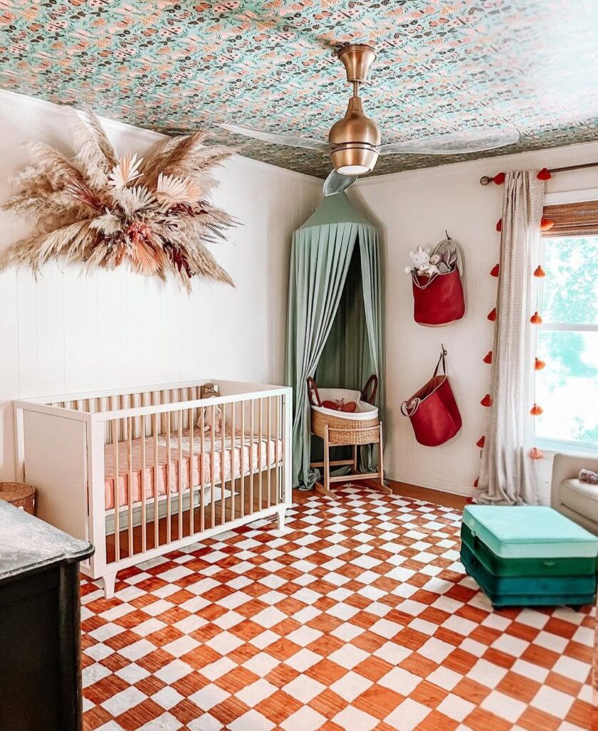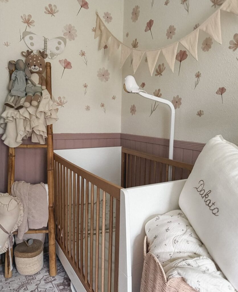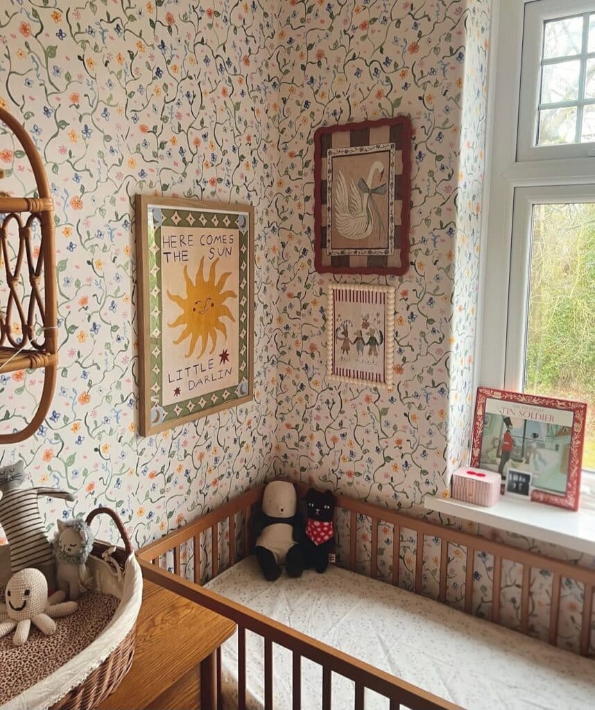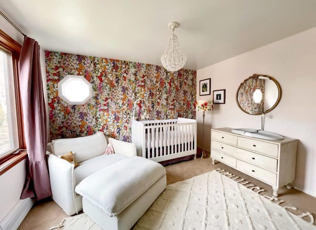 Dainty, feminine florals in the way of wallpaper creates such a whimsical look in the nursery below. Adding clashing prints to the walls creates an eclectic look that feels fitting of a nursery.