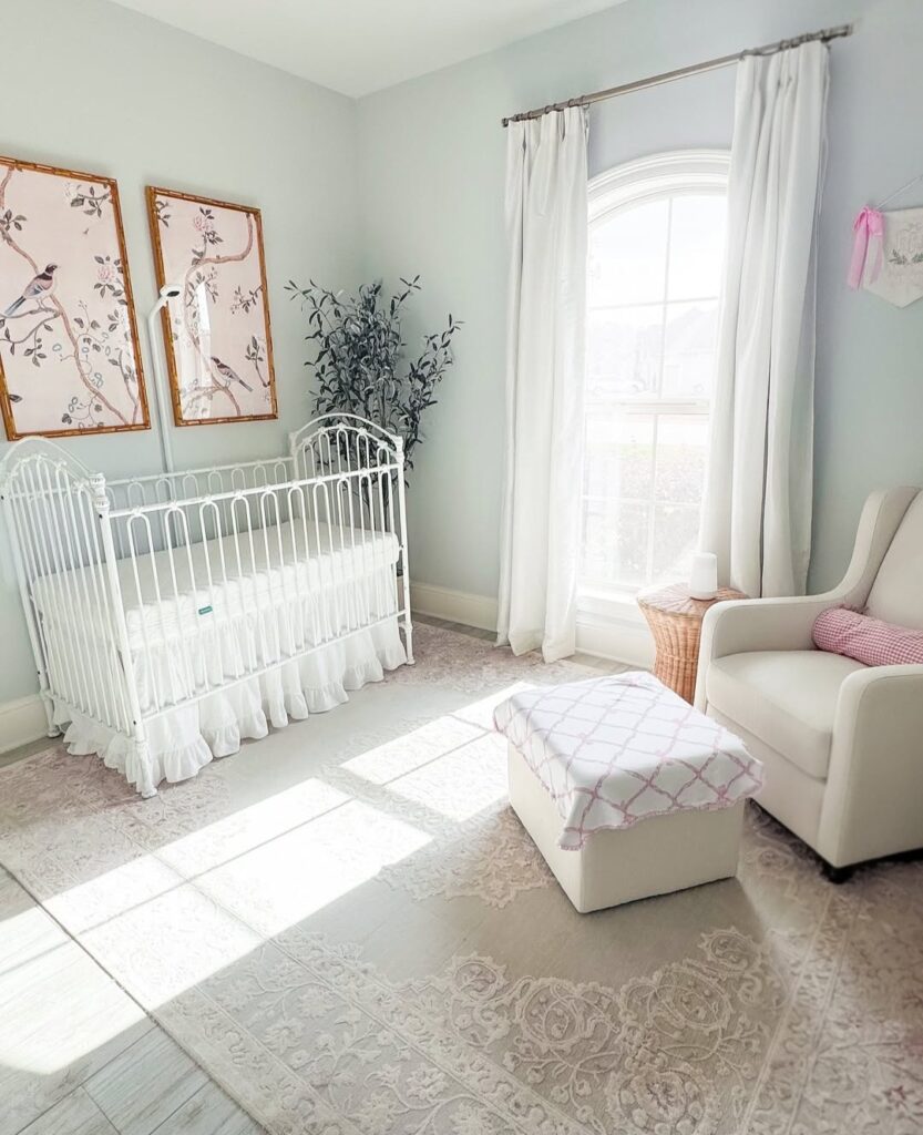 A grey based, soft off-white is a versatile paint color that’s well suited to sunny baby girl nurseries.
