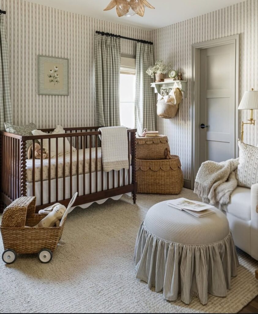 Wallpaper is a fun approach that can totally lift a nursery, just tonally match a color from the wallpaper into an accent or wall color in the room for an intentional feel.