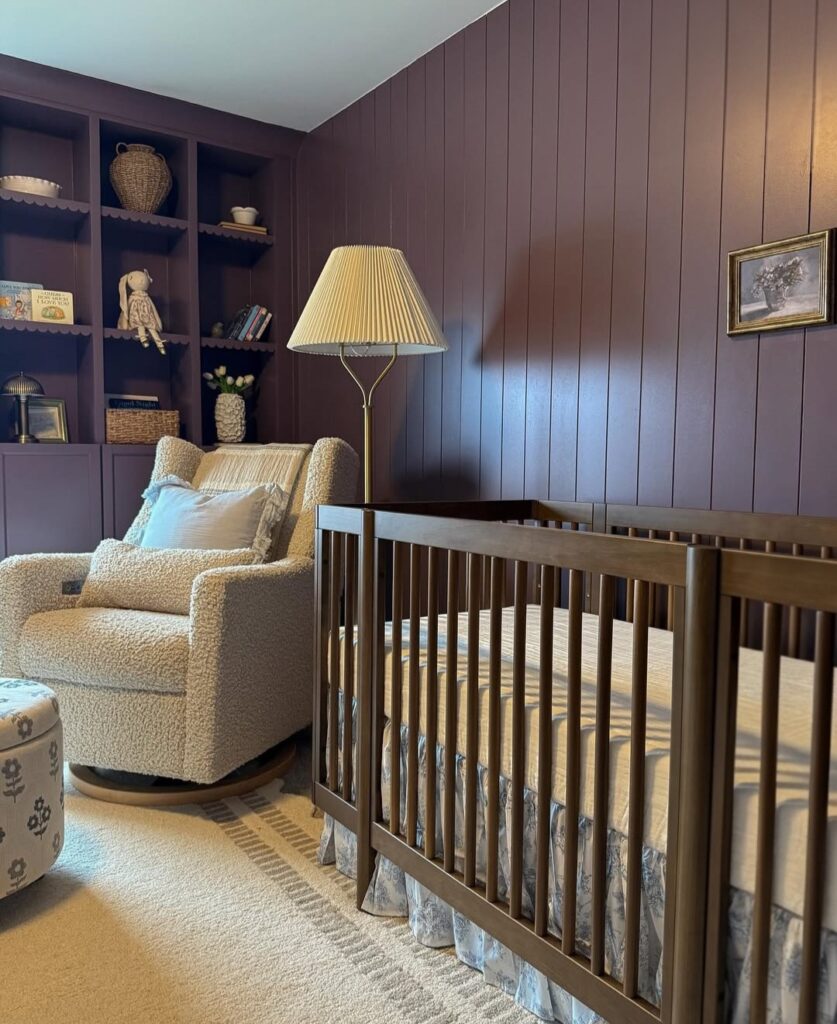 This deep aubergine shade is a really mature approach for a baby girl room that feels cosy and sophisticated.